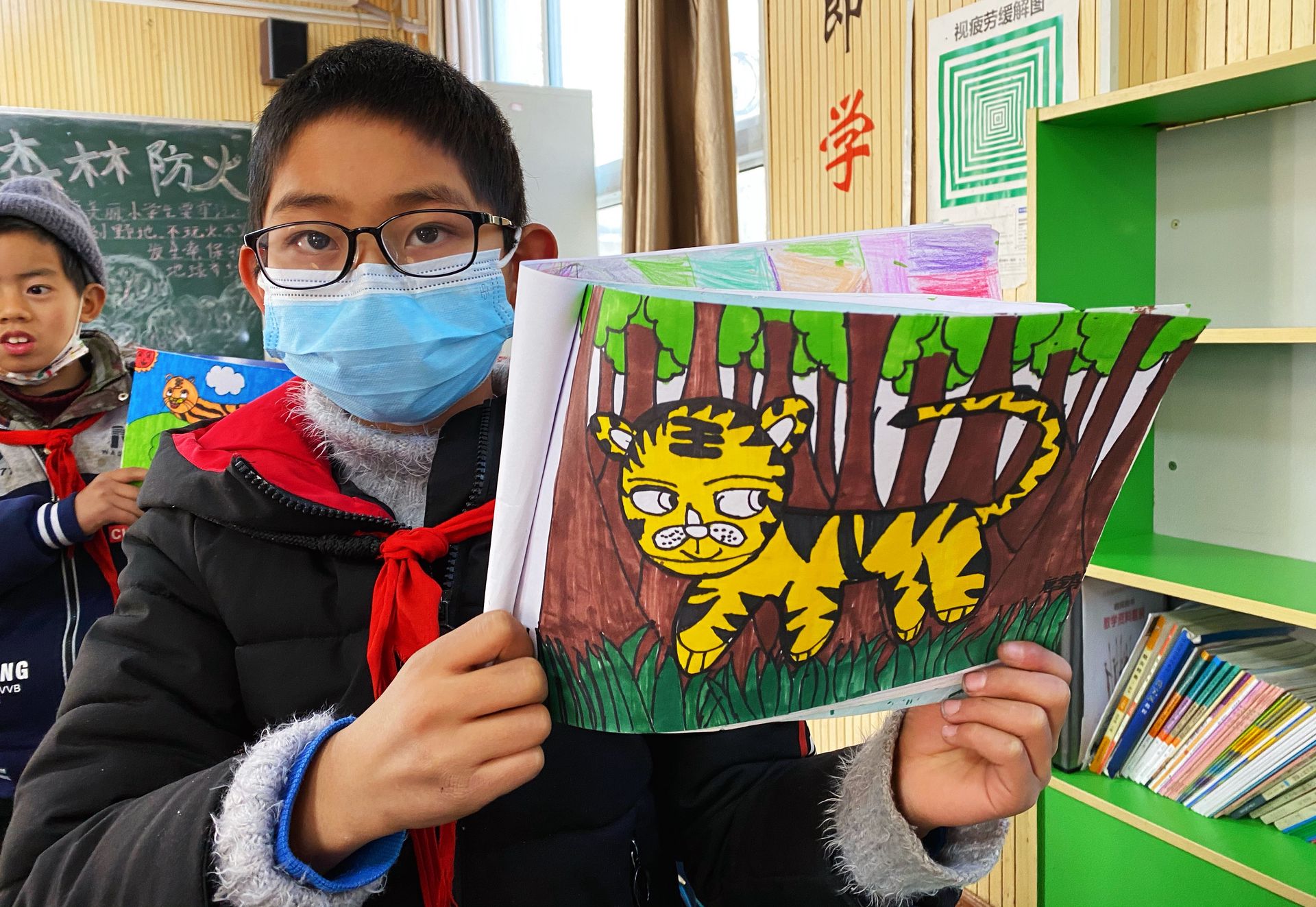 接下來的三天,來自西南財經大學天府學院藝術設計學院的老師,為同學們開啟環保美育課程,激發孩子們的創意想象空間,當同學拿起畫筆描繪著美麗的家鄉和可愛勇猛的老虎時,無比興奮和快樂!