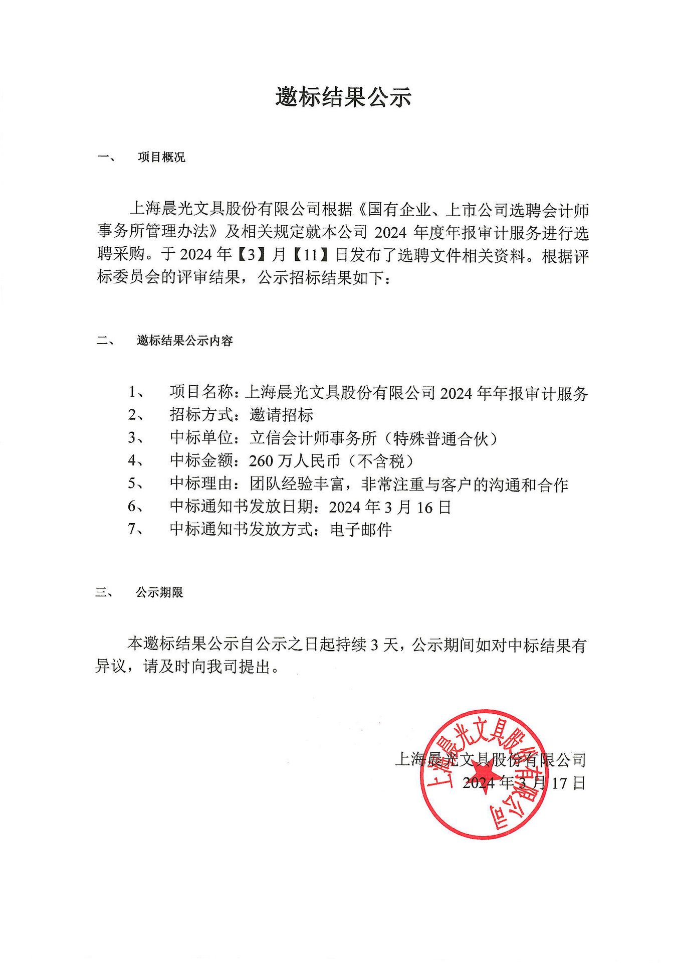 上海晨光文具股份有限公司2024年年報審計服務邀標選聘文件(邀標模式)