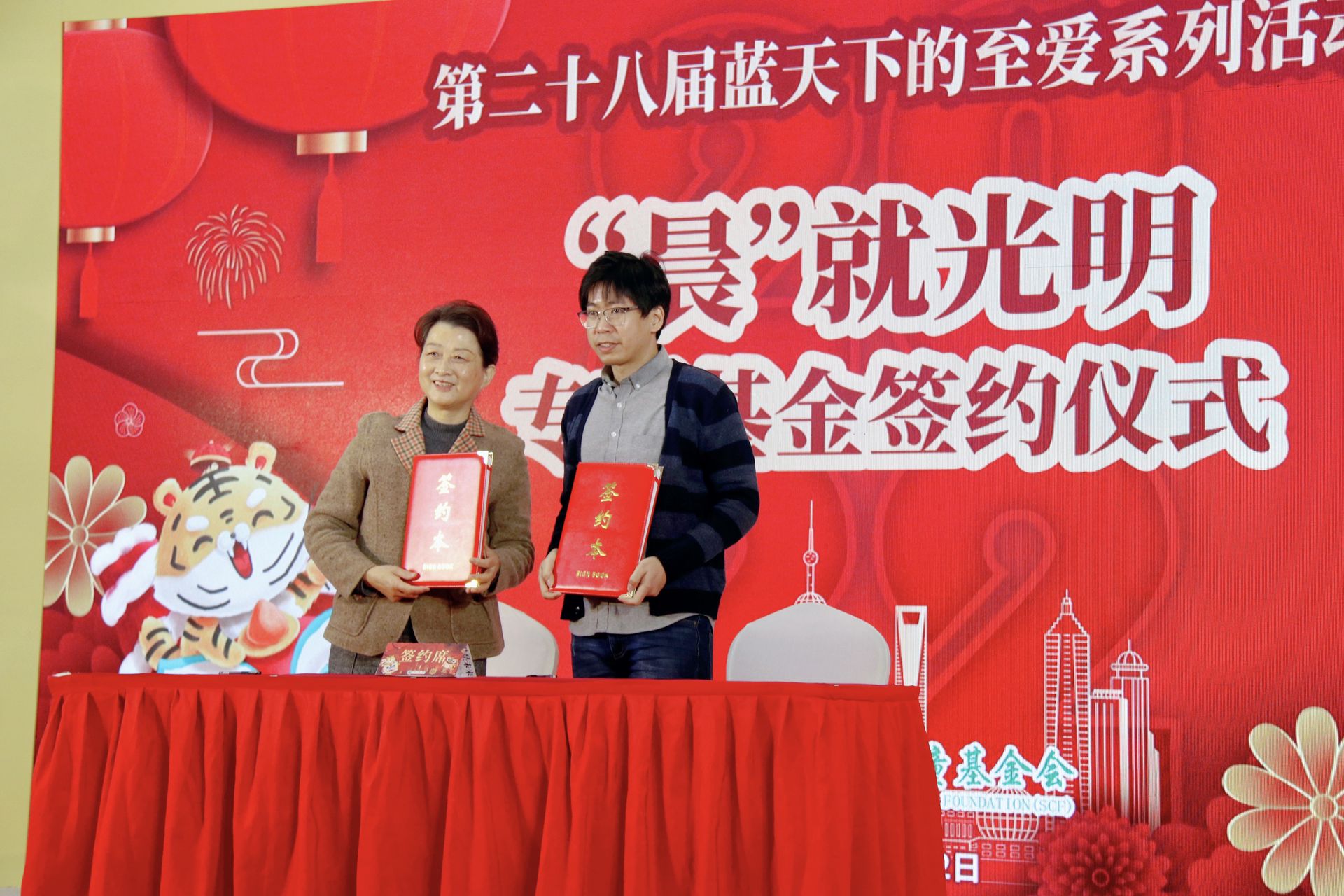 12月12日上海晨光公益基金會與上海市兒童基金會也在藍天下至愛系列活動上簽署〝晨就光明〞專項基金合作協議。