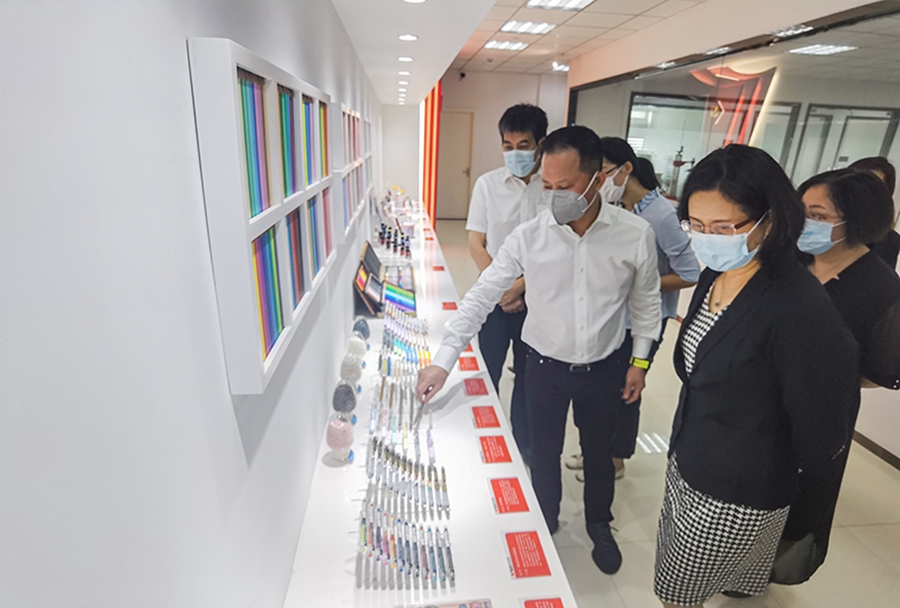 徐徠副局長一行在公司董事長陳湖文、生產中心總監郭士達、法務部總監潘高翔、對外事務部總監金琪、公共事務部總監徐京津陪同下,實地調研了晨光文具奉賢基地筆頭廠、模具廠、技術中心、黨群服務中心。