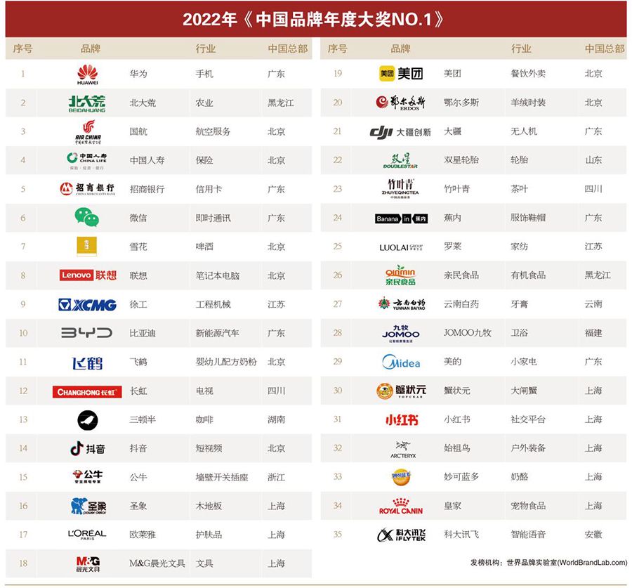 晨光、華為、飛鶴等在內的35個優秀品牌入選2022”中國品牌年度大獎NO.1“