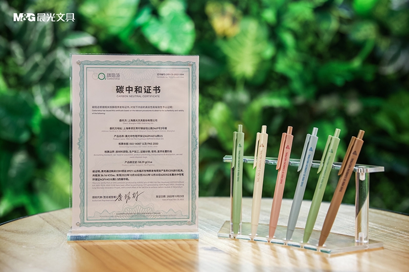 此系列產品從原材料獲取、生產加工、運輸分銷到使用、廢棄處置階段,達成全生命周期碳中和。每支碳中和系列中性筆筆身采用回收餐盒再造的再生塑料,可減少約2.3g塑料產生的碳排放,因此更加低碳。該系列產品通過第三方碳核查機構碳阻跡完成碳足跡核算和碳抵消,并獲得碳中和證書。