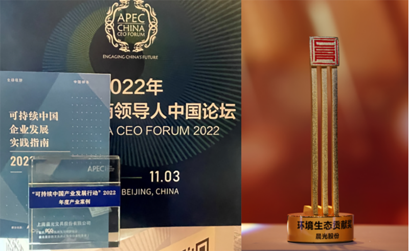 2022年,晨光在第二屆中國國際消費品博覽會上加入“全球可持續消費倡議”;作為國內文具行業唯一代表,晨光入選APEC“可持續中國產業發展行動”2022年度產業案例、“2022第一財經·中國企業社會責任榜”環境生態貢獻獎等榮譽,可持續發展的出色成績獲得國內外贊譽及認可。