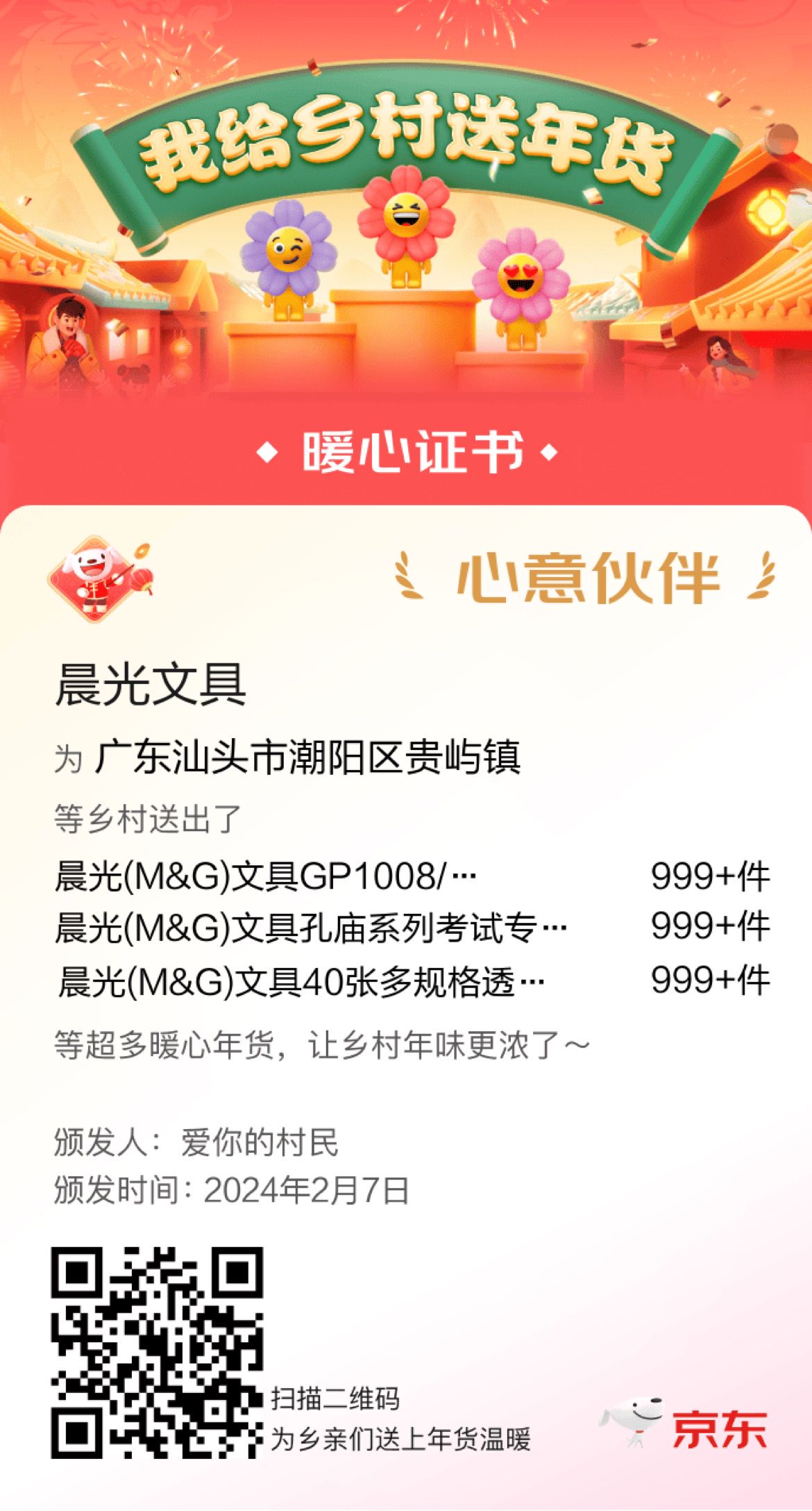 攜手京東“我給鄉村送年貨”活動 晨光為家鄉送出7000件愛心文具
