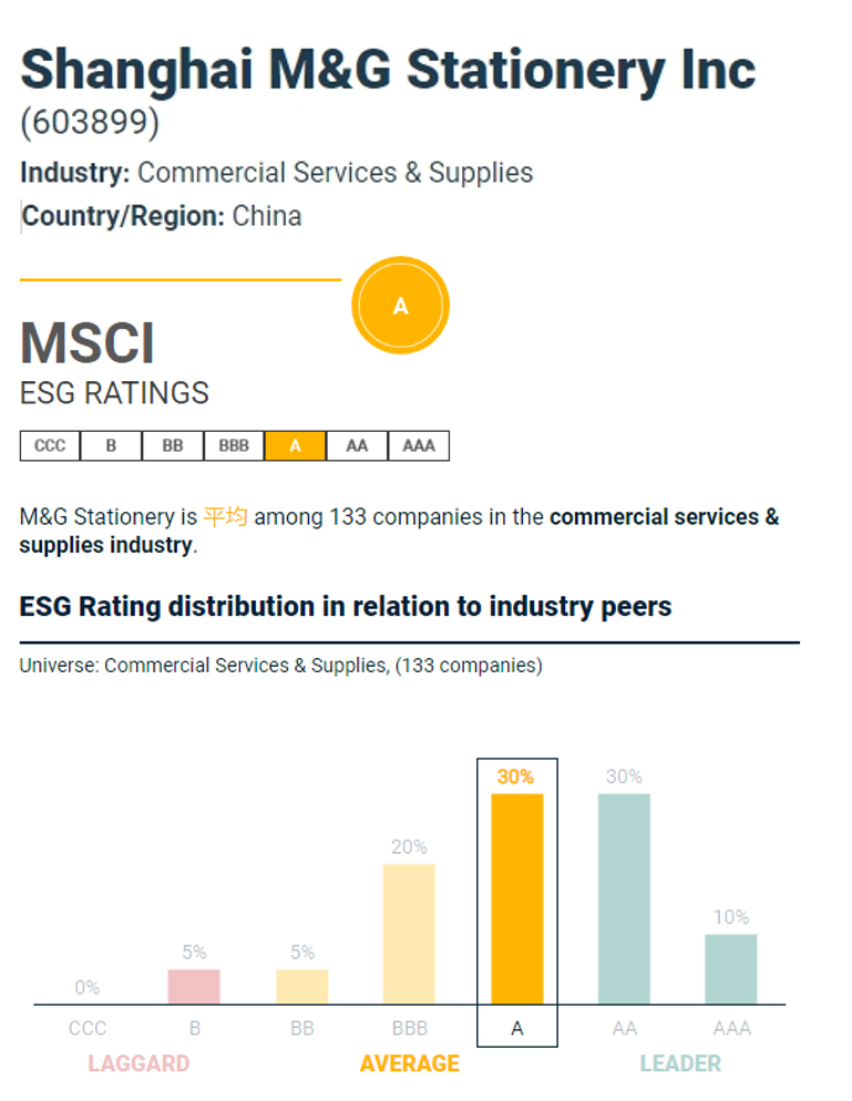 近期,國際權威指數機構——摩根士丹利資本國際公司(Morgan Stanley Capital International,簡稱“MSCI”)公布了晨光最新的ESG(Environmental,Socialand Governance,即環境、社會和公司治理)評級結果?;谠?span>ESG方面的切實舉措和不斷改善,晨光的MSCI ESG評級連續兩年實現評級提升,今年已躍升至“A”評級,并在企業行為(Corporate Behavior)議題領域成為行業領先者(ESG Leader),體現了國際權威評級機構對晨光ESG管理與實踐水平的認可。與此同時,晨光今年還先后榮獲“綠點中國·2024年度案例”綠色設計年度大獎、2024BrandZ中國創新明星品牌,并成功入選2024年《財富》中國ESG影響力榜及中國最佳設計榜等,可持續實踐成果獲得多方贊譽和認可。