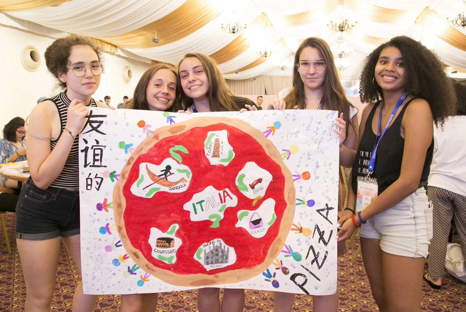 幾位少女,雖然來自不同的國家,卻共同用畫筆,繪制友誼的大披薩,愿友情長存。