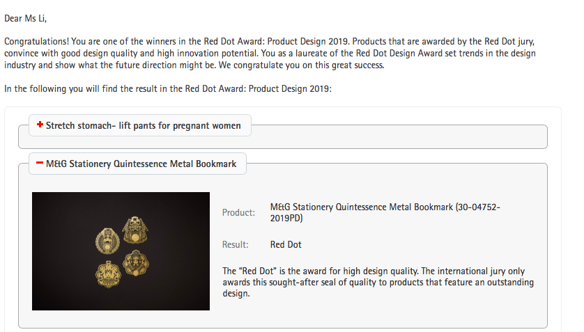 發布日期:2019-04-08近日,2019年德國紅點獎獲獎名單正式出爐。晨光文具盛世新顏系列-國粹金屬書簽憑借潮流與傳統相結合的美感、創意的設計、精細的做工從眾多參賽作品中脫穎而出,成為2019年紅點產品設計獎的佼佼者。這也是繼晨光首次斬獲2019德國iF獎后的又一世界級設計大獎!