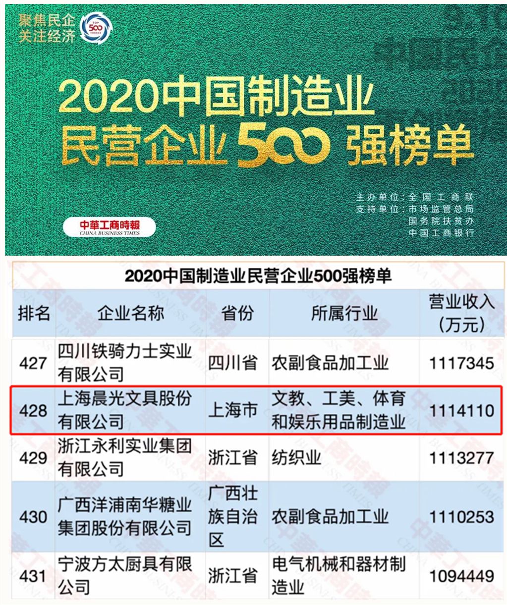 晨光文具首次入圍“2020中國制造業民營企業500強”